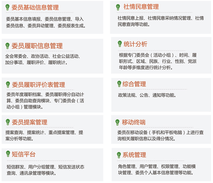 全面的委員基礎(chǔ)信息管理平臺(tái)提供委員基礎(chǔ)信息管理提供動(dòng)態(tài)采集功能、支持對(duì)委員異動(dòng)信息管理支持委員信息的批量導(dǎo)入、導(dǎo)出可將歷屆委員信息進(jìn)行存檔和調(diào)閱支持對(duì)委員賬號(hào)啟停管理根據(jù)需要自由組合條件進(jìn)行數(shù)據(jù)查詢科學(xué)的委員履職評(píng)價(jià)體系支持自定義委員履職評(píng)分規(guī)則提供委員履職打分規(guī)則模板,錦州網(wǎng)站建設(shè)供參考或使用系統(tǒng)可通過(guò)短信等形式將履職預(yù)評(píng)估情況推送給委員和專門(mén)委員會(huì),提醒委員進(jìn)行及時(shí)合格的履職。完善的委員履職信息報(bào)送體系支持管理委員的提案、社情民意、全會(huì)常委會(huì)、政協(xié)活動(dòng)、社會(huì)公益活動(dòng)等所有履職形式,根據(jù)不同的履職形式采取不同的信息報(bào)送流程,可由委員本人、專門(mén)委員會(huì)、活動(dòng)小組或部門(mén)管理員進(jìn)行履職信息報(bào)送對(duì)所有履職信息進(jìn)行科學(xué)合理的分類統(tǒng)計(jì)支持自動(dòng)生成委員的個(gè)人年度履職檔案全方位的委員履職評(píng)價(jià)體系可根據(jù)委員構(gòu)成、履職形式、時(shí)間段、不同的專門(mén)委員會(huì)等多維度,進(jìn)行單項(xiàng)或組合的數(shù)據(jù)統(tǒng)計(jì)分析。
