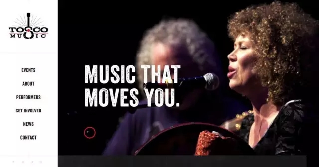 以Tosco Music 為例,他們的頁(yè)面設(shè)計(jì)就給訪(fǎng)客的第一印象就相當(dāng)不錯(cuò),網(wǎng)站中包含了一系列有趣的視覺(jué)設(shè)計(jì):
