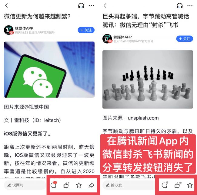 此外,有網(wǎng)友反饋,在騰訊新聞App內(nèi),相關(guān)媒體報(bào)道的分享轉(zhuǎn)發(fā)按鈕徹底消失了,而在騰訊新聞內(nèi)搜索"騰訊封禁飛書",其資訊頁搜索結(jié)果不會(huì)出現(xiàn)相關(guān)新聞報(bào)道。希望騰訊新聞作為一個(gè)新聞平臺(tái),能夠公平、公正、客觀地呈現(xiàn)報(bào)道,停止干預(yù)輿論傳播秩序。