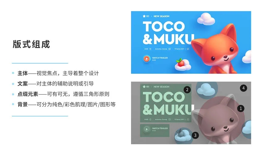 3. 點(diǎn)綴元素:裝飾元素,可有可無(wú),具體根據(jù)版面需要;好的點(diǎn)綴元素能夠渲染氣氛,大部分的點(diǎn)綴元素遵循三角形原則,類似下圖中的云朵,群演的作用。