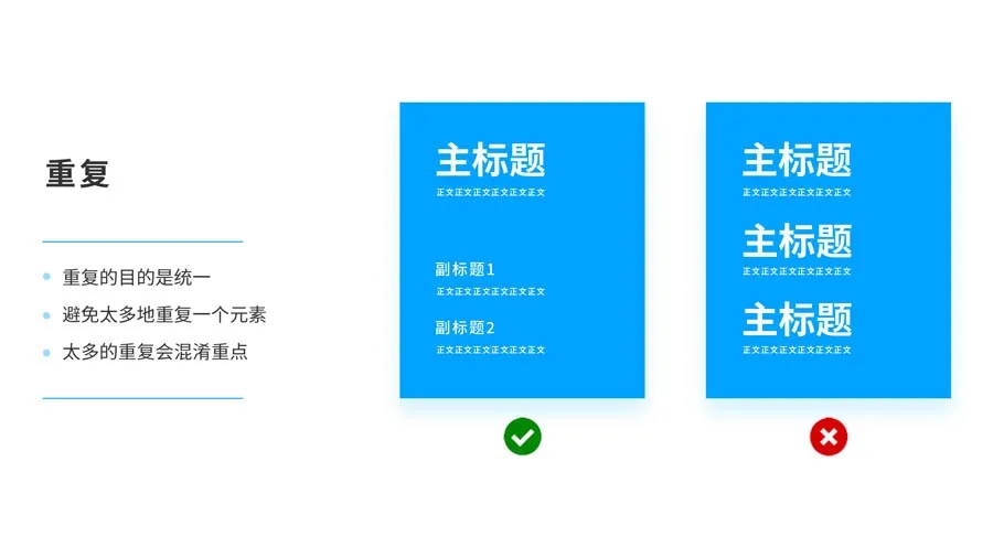重復(fù)的目的是統(tǒng)一,并增強(qiáng)視覺(jué)效果。比如標(biāo)題都是同一個(gè)字體或大小或粗細(xì)。