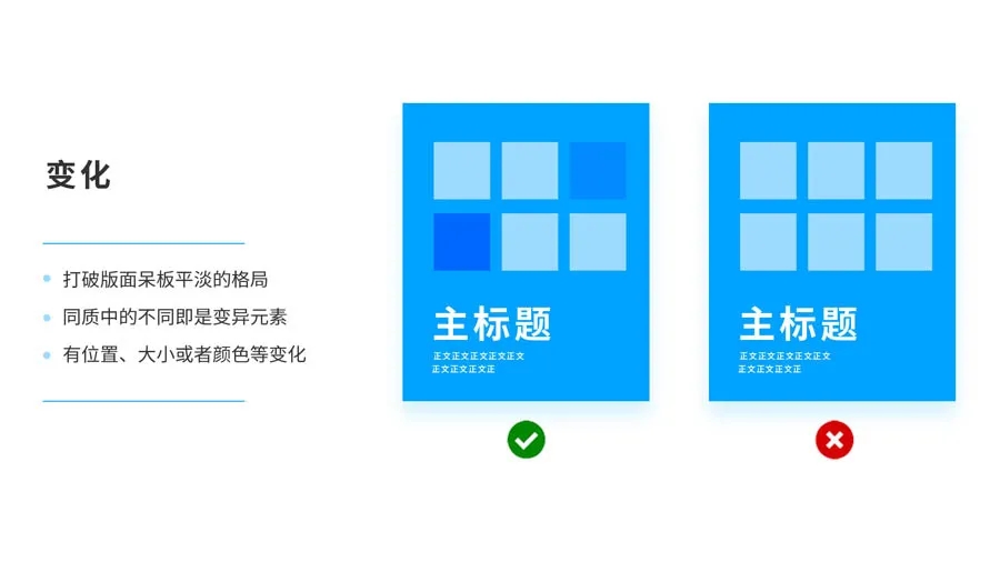 一成不變的元素會(huì)容易乏味無(wú)趣,版面也缺乏靈活感,如果將一些元素發(fā)生位置,大小或者顏色變化,打破版面呆板、平淡的格局,使得畫面非常有層次感,不失為打破格局的好方法。