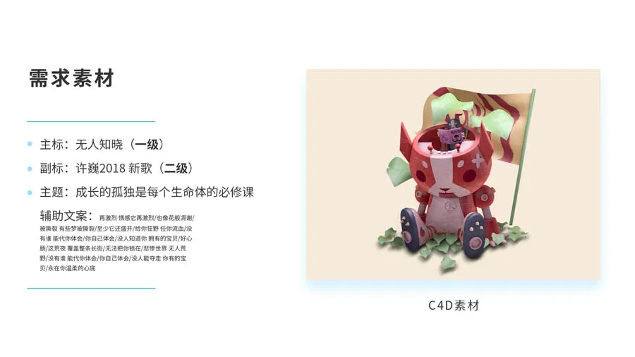 當我們的工作內(nèi)容無法滿足做文字比較多的平面海報的欲望時,可以考慮自命題的練習。當時聽到許巍《無人知曉》這首新歌的時候,有一些感悟和想法然后做了一些C4d素材,想利用它作為主體和歌名做一下排版練習: