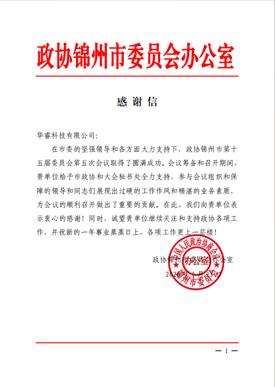 遼寧華??萍极@政協(xié)錦州市委員會(huì)辦公室感謝信,表彰其對(duì)市政協(xié)十五屆五次會(huì)議成功召開做出的重要貢獻(xiàn)。